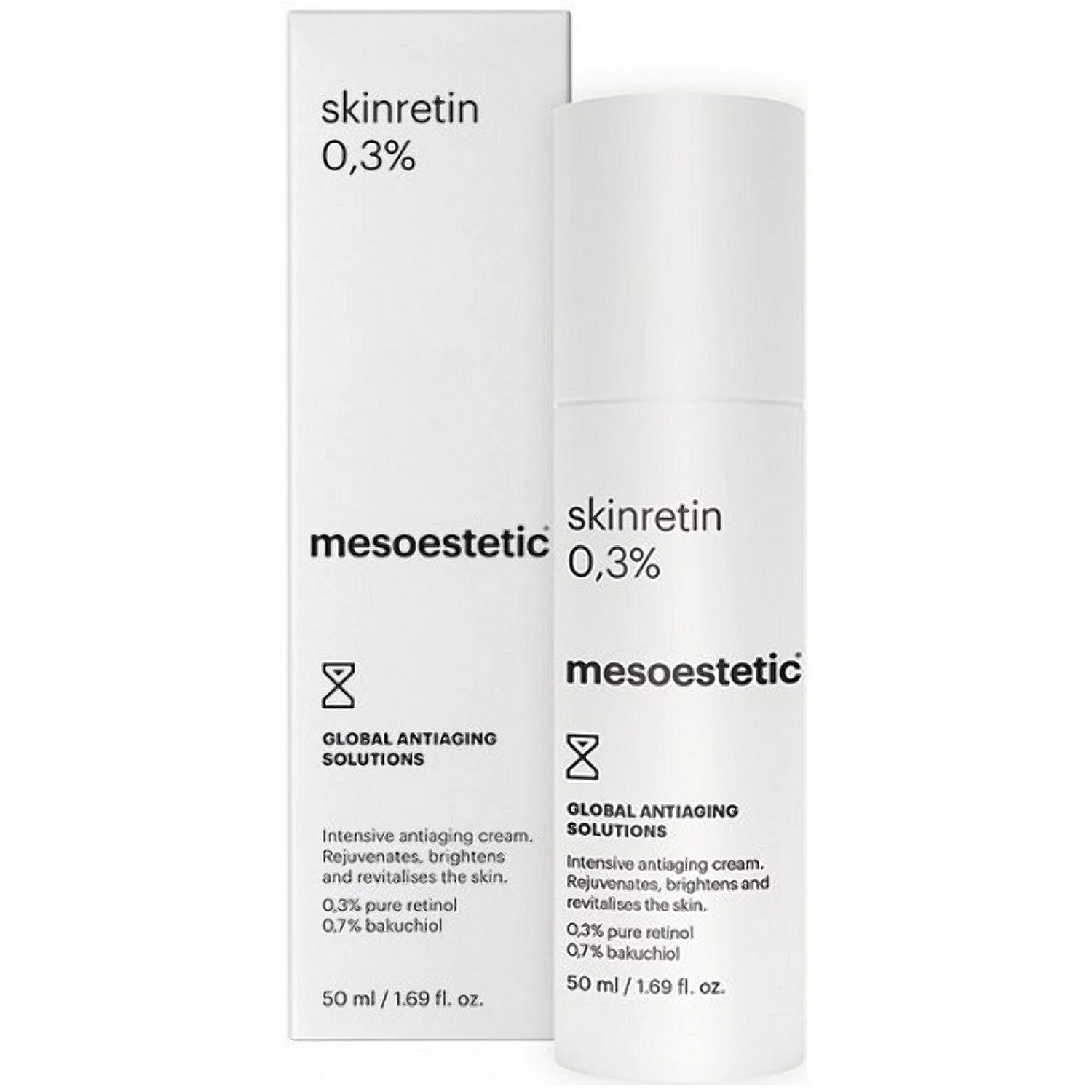 Крем Mesoestetic skinretin 0,3% із чистим ретинолом та бакучиолом із глобальною антивіковою дією для лікування зморшок, плям, втрати сяйва та еластичності шкіри.