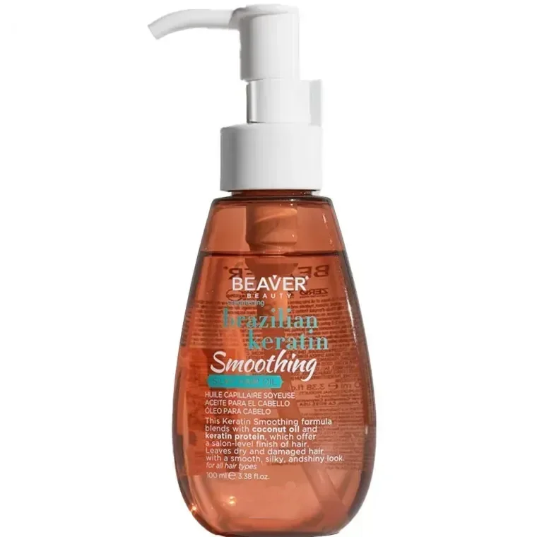 BEAVER Brazilian Keratin Silky Hair Oil — кератиновое масло, которое обеспечивает разглаживание, укрепление и эластичность волос. Благодаря формуле с бразильским кератином средство интенсивно восстанавливает структуру волос, устраняет пушистость и придает мягкость, шелковистость и послушность. Масло защищает волосы от термического воздействия фена и утюжков, уменьшает ломкость и придает естественный блеск.