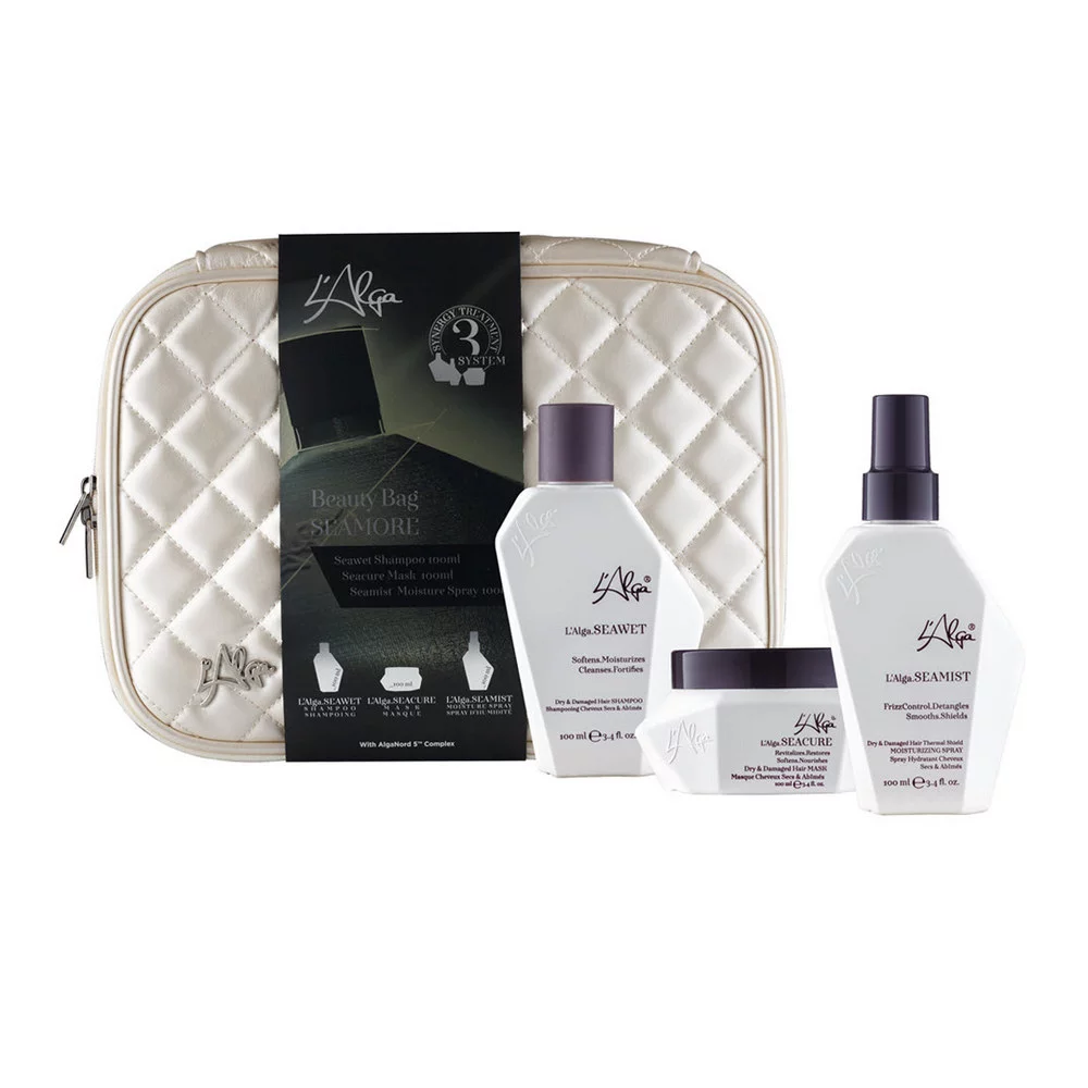 В состав набора входят: L’Alga Seawet Shampoo 100ml + L’Alga Seacure 100ml + L’Alga Seamist Moisture Spray 100ml + Pearl Beauty Bag
