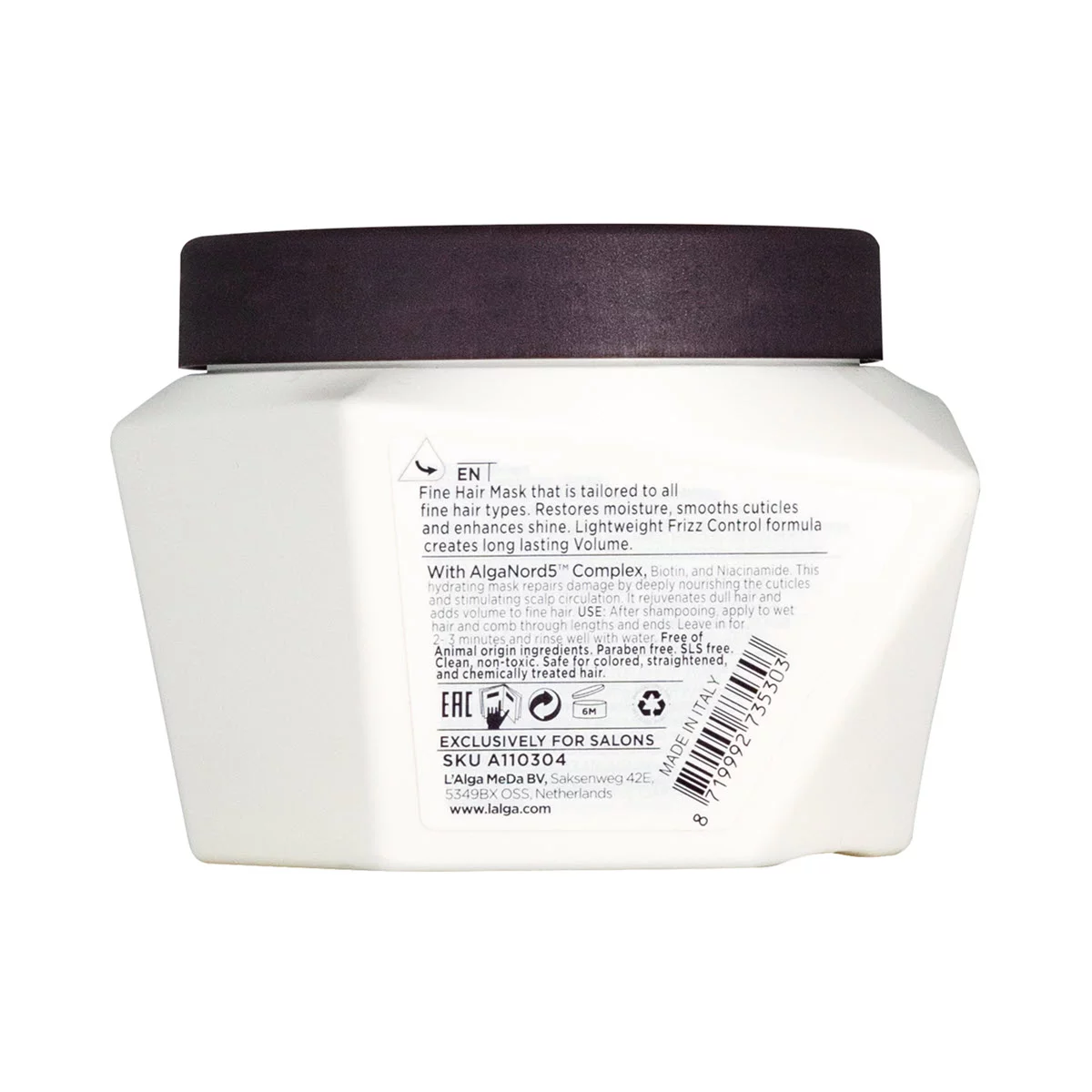 Разработана специально для всех типов тонких волос. Нормализует баланс влаги в структуре волос, разглаживает кутикулу и усиливает блеск. Эта увлажняющая маска с комплексом AlgaNord5, биотином и ниацинамидом восстанавливает поврежденные участки, глубоко питает кутикулу и стимулирует микроциркуляцию кожи головы. Невесомая формула обеспечивает контроль пушистости и придает волосам длительный объем. Оживляет тусклые волосы, увеличивает плотность.