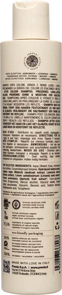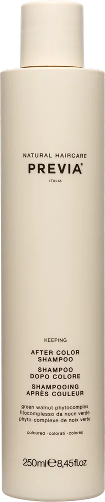 Natural Haircare Previa KEEPING After Color Shampoo Шампунь для окрашенных волос с фитокомплексом зеленого грецкого ореха. Деликатно очищает волосы, увлажняет их и придает блеск. Усиливает яркость цвета и удлиняет его стойкость. 97,5% ингредиентов натурального происхождения и ингредиентов, полученных органическим земледелием.