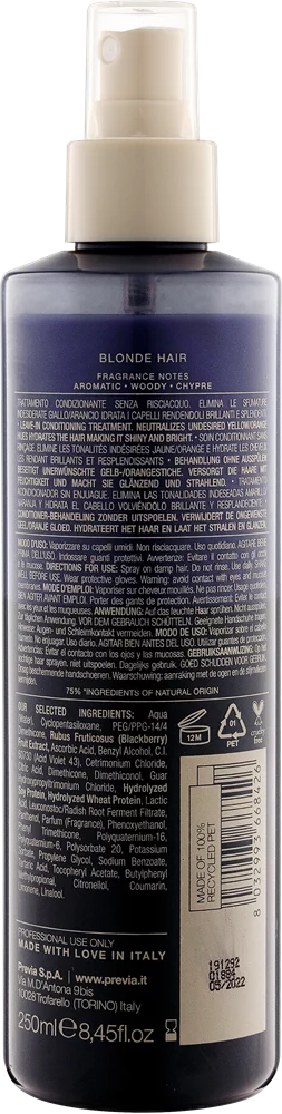 Несмываемый кондиционер для светлых, седых или обесцвеченных волос. Устраняет нежелательные желтые и оранжевые оттенки. Интенсивно увлажняет, дарит волосам блеск и сияние.
