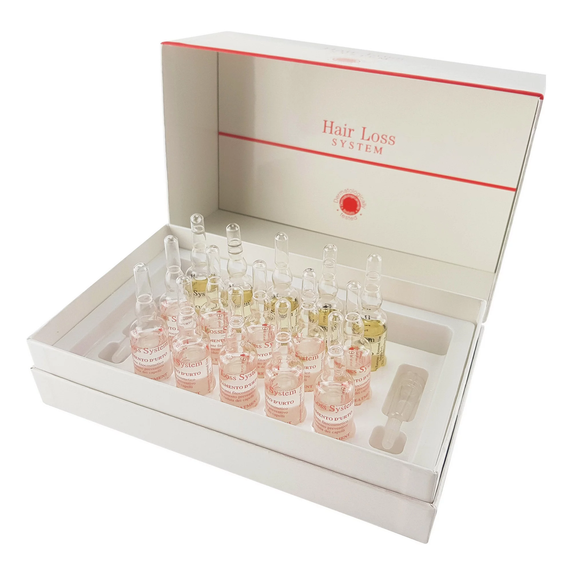Но главная задача лежит на гликопротеинах и гидрогликосаминогликанах, входящих в состав белой ампулы. Hair Loss System получила сертификацию в Государственном Университете Феррары, и все тесты были проведены не на животных.