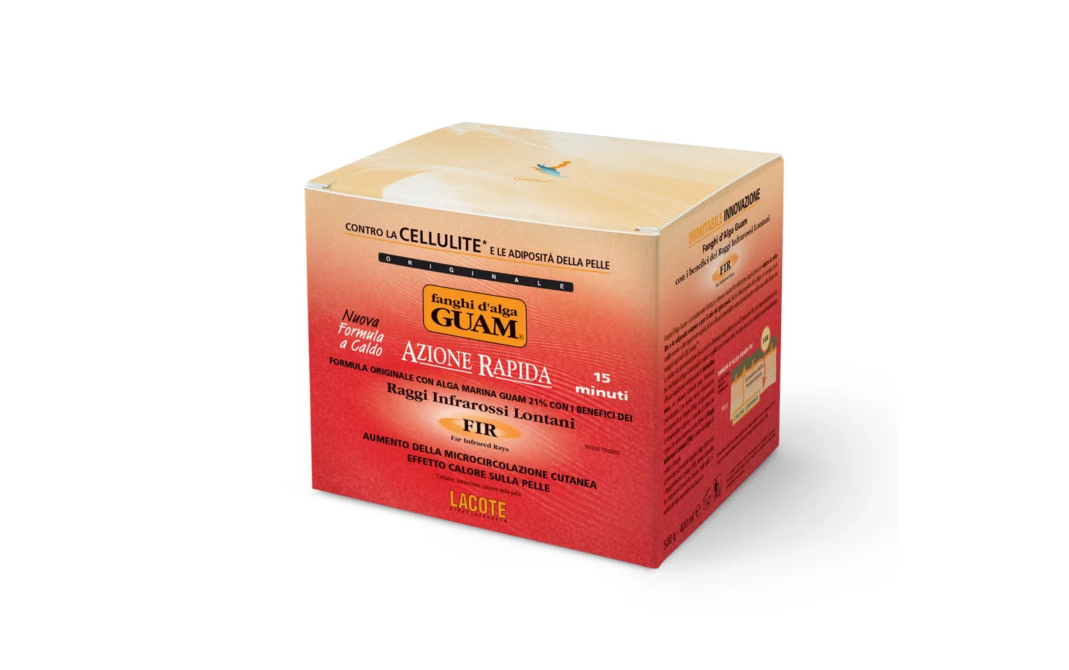 Антицелюлітна маска з морських водоростей GUAM FIR «прискорена формула» з розігрівальною дією Fangid’Alga GUAM FIR “Azione Rapida” – це інноваційний винахід. У новій версії знамениті антицелюлітні маски GUAM, що не піддаються імітації, об’єднані з дією довгохвильового інфрачервоного випромінювання FIR (Far Infrared Rays)!