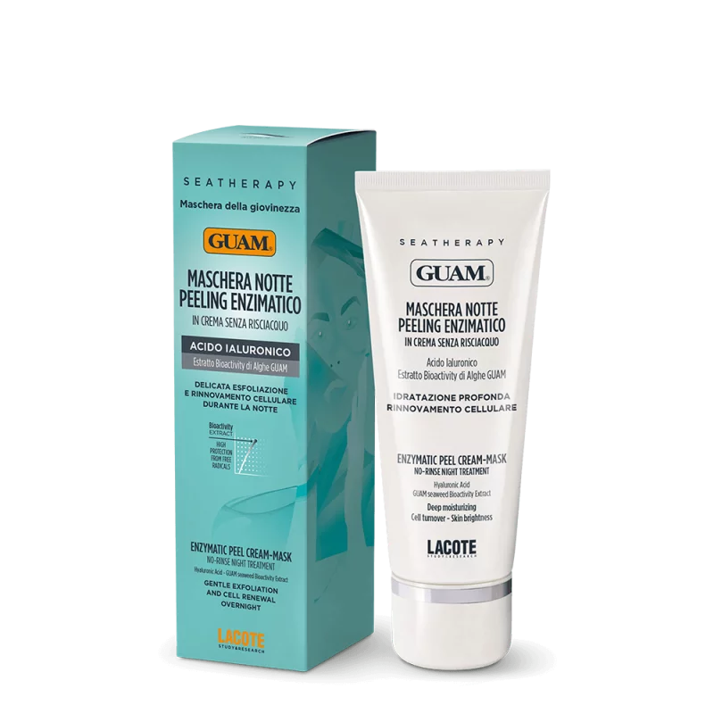 Нічна ензимна пілинг-маска для обличчя GUAM SEATHERAPY має відновлювальну дію, яка проявляє себе під час вашого сну вночі. Після пробудження ваша шкіра стає більш свіжою, добре зволоженою, сяйнистою та виглядає молодшою. Засіб забезпечує делікатну ензимну ексфоліацію, яка допомагає налагодити процес нормального відновлення клітин шкіри, котрий часто може уповільнюватися з віком. Делікатне відлущення шкіри сприяє відновленню її тонусу та сяяння. Завдяки дії активних компонентів маска відновлює захисний бар’єр шкіри та сприяє її зволоженню, допомагає зменшити шорсткість шкіри. Маска залишає приємне відчуття відновлення та свіжості на шкірі.