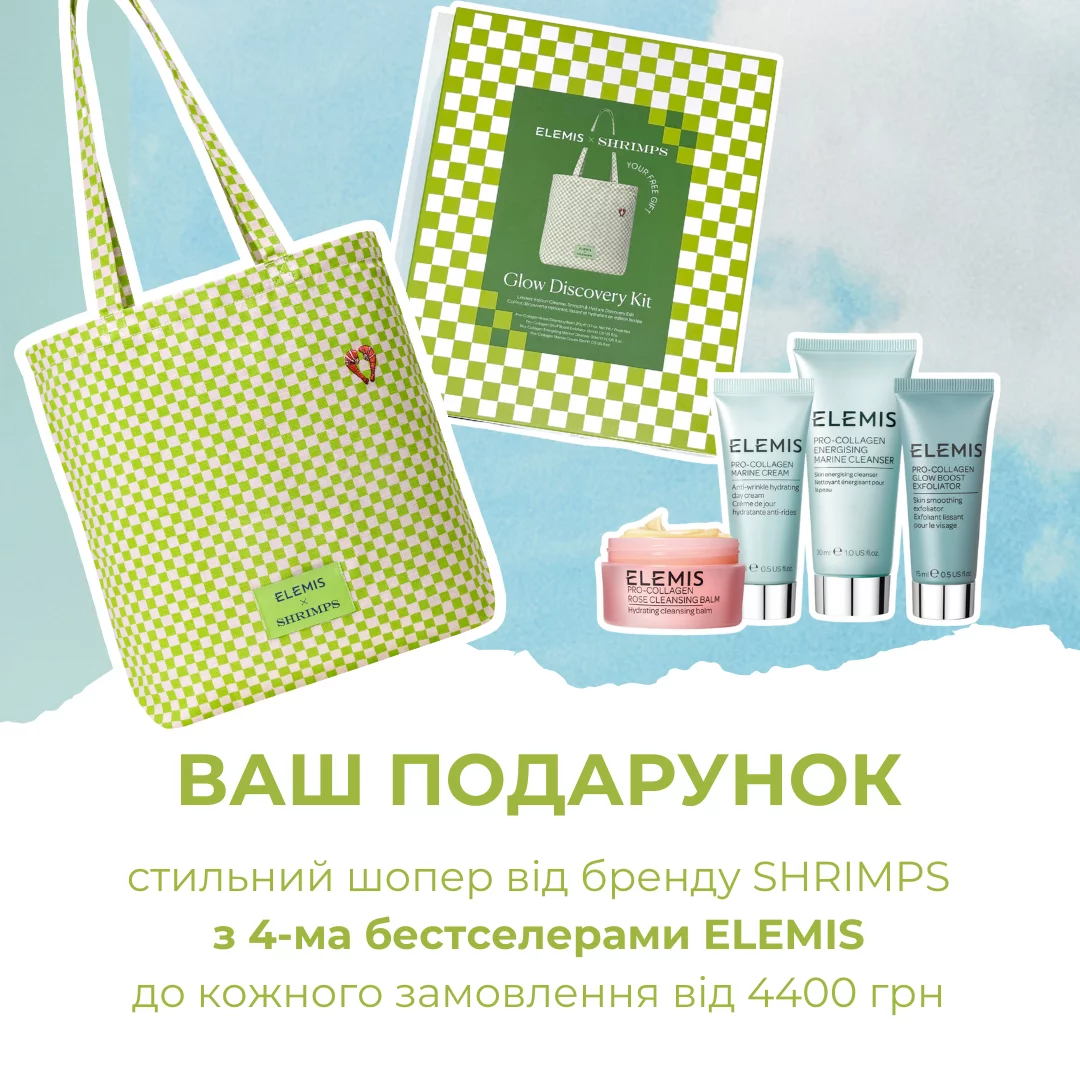 Замовляйте будь-які продукти бренду ELEMIS на суму від 4400 грн, отримайте в подарунок стильний шопер Shrimps з 4-ма продуктами бестселерами у тревел-розмірі.