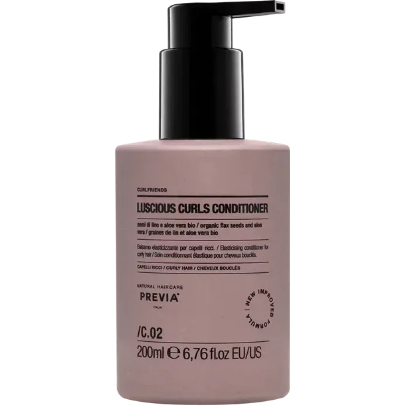 Previa Natural Haircare CurlFriends Luscious Curls Conditioner – професійний засіб для догляду за хвилястим і кучерявим волоссям. Унікальна формула, що містить органічні екстракти насіння льону, алое вера, рису та бамбука, збагачена аргоновою олією й аргініном, забезпечує глибоке зволоження, пом’якшення та збереження природної форми локонів. Кондиціонер легко розплутує волосся, не обтяжує його, зменшує пухнастість і додає блиск.