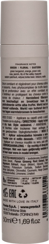 Регенерувальний філер-серум для пошкодженого і ламкого волосся. Проникає глибоко в структуру з інтенсивною противіковою заповнювальною дією. Відновлює волосся зсередини, робить його здоровим та міцним. Таким же чином діє і на поверхні з термозахисним ефектом. Зменшує розшарування кінчиків. Надає волоссю блиску, м'якості та шовковистості.