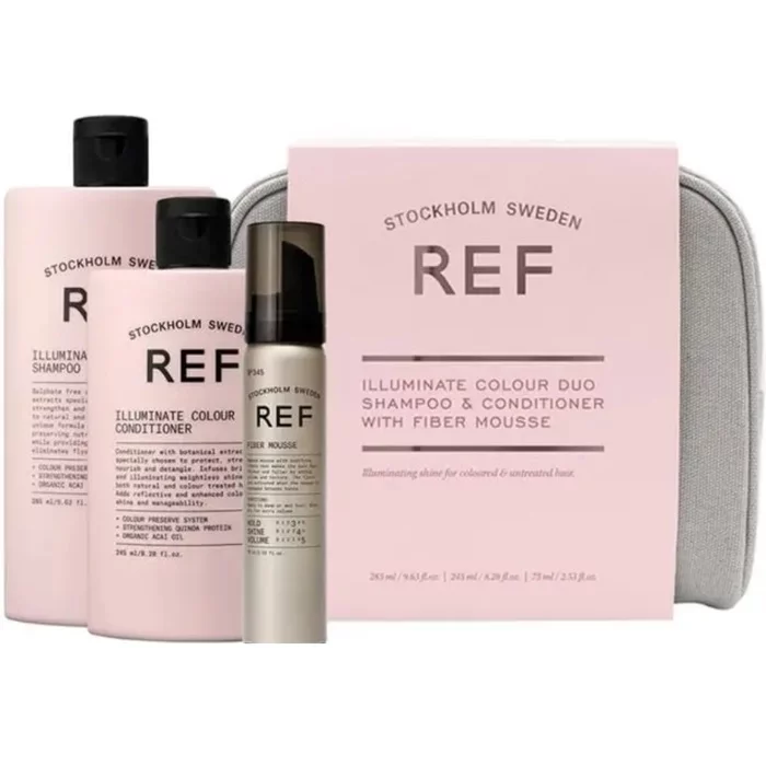 Набір створений для догляду та збереження кольору фарбованого волосся. Шампунь і кондиціонер містять комплекс рослинних екстрактів і олій, доглядають волосся, живлять, зволожують, зберігають насиченість і яскравість відтінку, розгладжують, роблять пасма слухняними і блискучими. Унікальний мус із зміцнюючими волокнами полегшить процедуру укладання та забезпечить фіксацію, додасть гарний об'єм та блиск. Набір засобів серії Illuminate Colour - це доглянуте волосся та більш тривале носіння відтінку.
