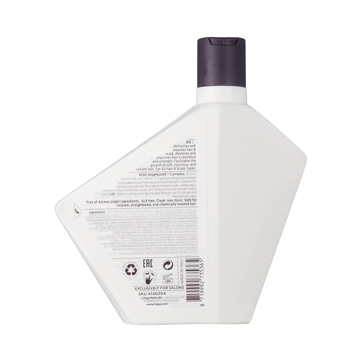 Освежает и очищает волосы и кожу головы. Восстанавливает и улучшает эластичность волос, придает им силу. Способствует росту мягких, роскошных и сияющих волос. Формула с комплексом AlgaNord5™, биотином, ниацинамидом и кофеином деликатно очищает волосы и кожу головы от излишков кожного жира и перхоти. Восстанавливает естественный баланс кожи головы и стимулирует обновление клеток. Шампунь насыщает волосы влагой, укрепляет кутикулу и повышает внутреннюю прочность каждой пряди. Подходит для всех типов волос и кожи головы.