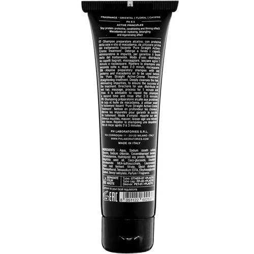 ШАГ 1. ПОДГОТОВИТЕЛЬНЫЙ ШАМПУНЬ Глубокого очищения | PH 8.5 Очищает и готовит волосы к процедуре выпрямления Щелочной шампунь с протеинами сои и маслом макадамии предназначен для использования перед средством Pure Straight Active-Creme. Глубоко очищает волосы, удаляя загрязнения и повышая эффективность процедуры выпрямления. Уровень pH 8.5 ШАГ 2. КРЕМ-АКТИВ ДЛЯ ИСПРАВЛЕНИЯ ВОЛОС Профессиональное средство для выпрямления волос. Длительный эффект. Формула обогащена глиоксиловой кислотой, протеинами сои и маслом макадамии. Превращает вьющиеся, волнистые и пушистые волосы в послушные, шелковистые и блестящие. Уровень pH 1.2 – 1.4 Шаг 3. Закрепляющая маска после ухода Дисциплинирующая маска с протеинами сои и маслом макадамии разработана для завершения процедуры выпрямления и поддержания эффекта после процедуры. Благодаря кислотному уровню pH запечатывает кутикулу, обеспечивая защиту от атмосферной влажности и придавая волосам гладкость ишелковистости. Питает, делает пряди послушными и блестящими. Уровень pH 2.0 – 3.0 Применение: ШАГ 1. ПОДГОТОВИТЕЛЬНЫЙ ШАМПУНЬ: распределите по влажным волосам массирующими движениями, оставьте на 1 минуту, смойте. Рекомендуется использовать шампунь повторно: на этот раз выдержите 2-3 минуты и затем смойте. ШАГ 2. КРЕМ-АКТИВ: нанесите на дважды вымытые и высушенные на 75% волосы и распределите по длине и кончикам, отступая 5 мм от кожи головы. Оставьте пряди в вертикальном положении на 40 минут (если нужно, оставьте волосы под источником тепла). Быстро смойте (не более 5 секунд), чтобы удалить излишки продукта и уменьшить образование пара в процессе выпрямления. Высушите и выпрямите волосы феном. Разглаживайте каждую прядь по 6-10 раз выравнивателем, нагретым до 210-230 °C, в зависимости от структуры волос. Тщательно смойте. Шаг 3. Закрепляющая маска: распределите равномерно по волосам, помассируйте и оставьте на 5 минут, затемсмойте. Высушите волосы феном и произведите укладку с выравнивающим эффектом.