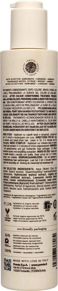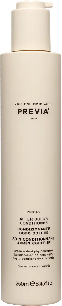 Natural Haircare Previa Keeping After Color Conditioner Кондиционер для окрашенных волос с фитокомплексом зеленого грецкого ореха. Действует на поверхность, увлажняя волосы. Запечатывает кутикулу, удлиняет цветостойкость и помогает сохранить блеск. Мгновенно придает волосам мягкость и шелковистость. Не отягощает и не оставляет следы.