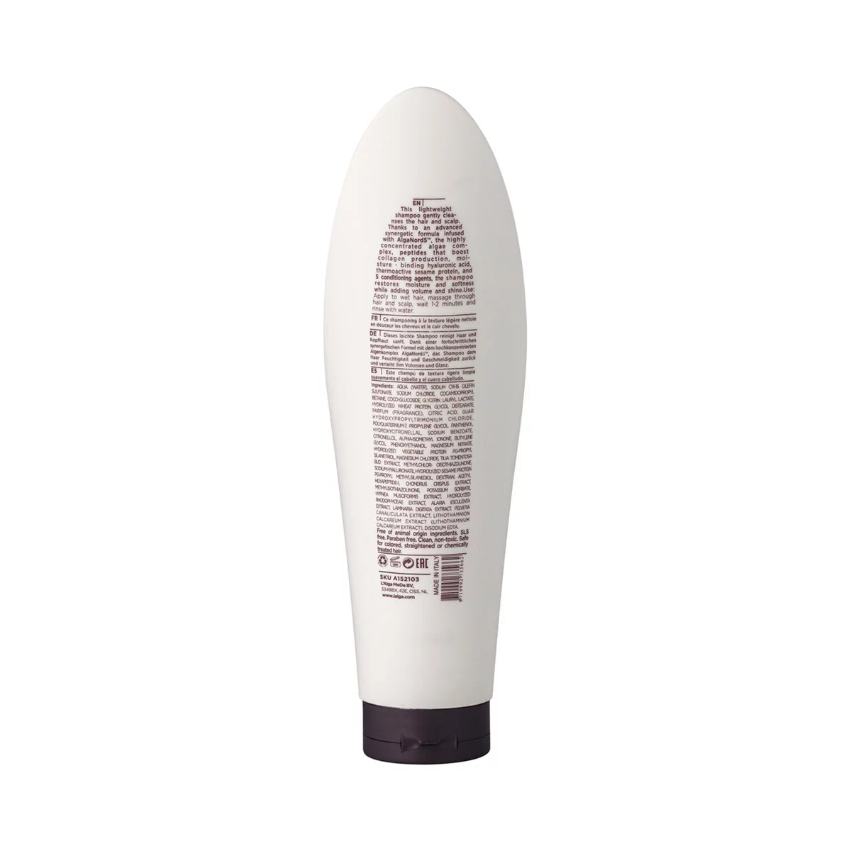 Легкий шампунь, деликатно очищающий волосы и кожу головы. Синергетическая формула с высококонцентрированным комплексом AlgaNord5™, пептидами, стимулирующими выработку коллагена, гиалуроновой кислотой, термоактивным кунжутным протеином и 5 кондиционирующими веществами восстанавливает баланс влаги в структуре волос, возвращает ему мягкость, придает блеск и объем.