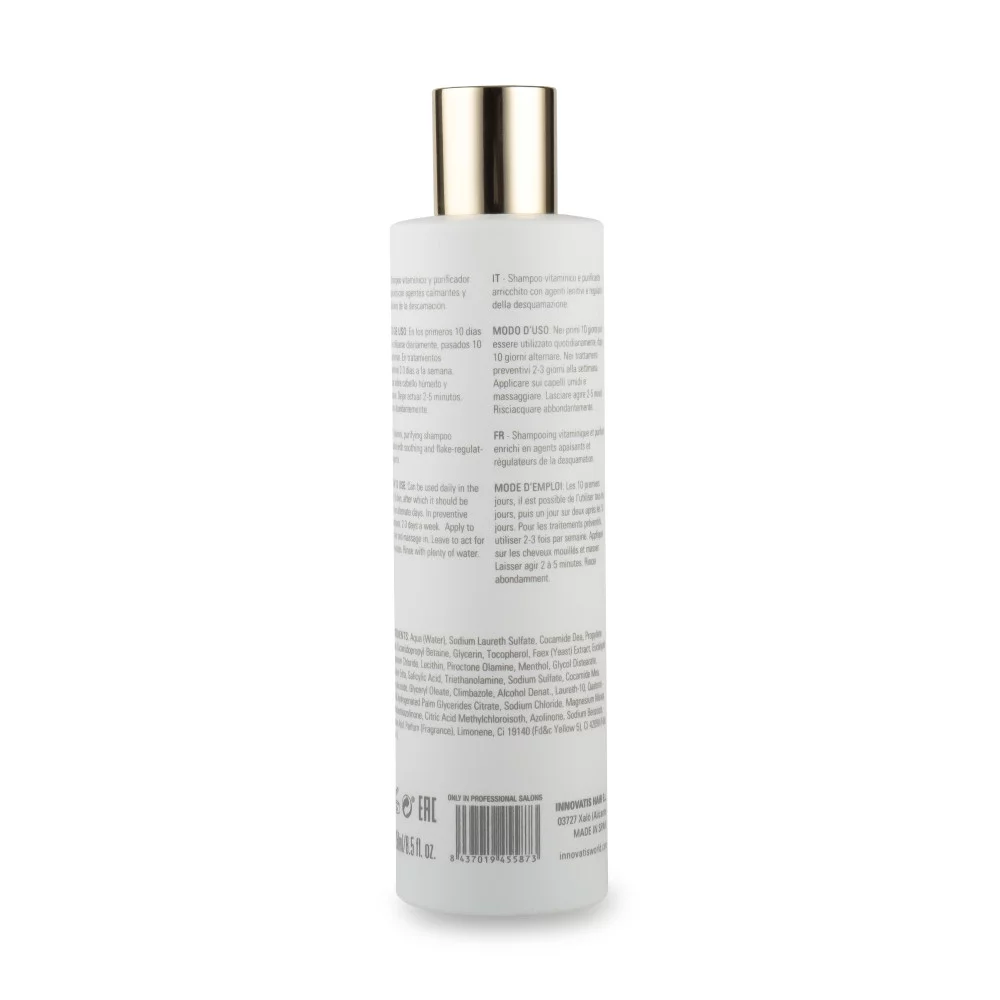 Вітамінний, очищальний шампунь, збагачений заспокійливими властивостями та функцією контролю оновлення шкіри.